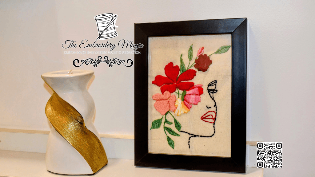 Hand made embroidery from a home-based business. A modern art depicting a female face with flower. Can be used an excellent gift on all occasions and can be used as a Wall-hanging art piece or a Table decor. The Embroidery is available in a Premium Photo frame.