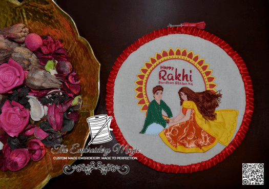 Hand made embroidery from a home-based business. Best suitable for a gift between siblings on the occasion of Raksha Bandhan. The design depicts the practice of a sister tying rakhi on her brother’s wrist. The sister is in an Orange Dress and the brother wearing a Green kurta. The artwork comes with an excellent combination of embroidery, painting, textile and thread work. The Embroidery is available in a Regular Wooden Embroidery Hoop.