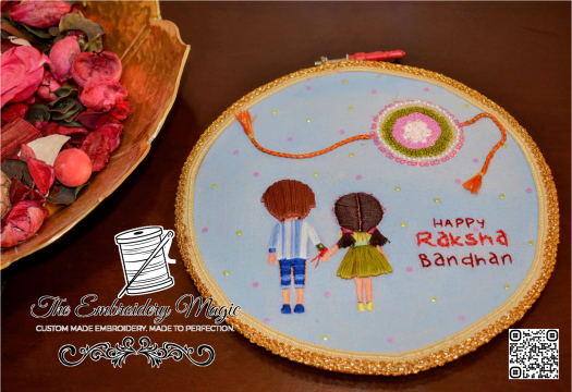 Hand made embroidery from a home-based business. Best suitable for a gift between siblings on the occasion of Raksha Bandhan. The design depicts the beautiful love-bond between a brother and a sister. The brother and sister are holding each other’s hand and gazing towards the horizon after the sister has tied the Rakhi on the brother’s hand. With a beautifully crafted Rakhi made of sequins and pearls. The artwork comes with an excellent combination of embroidery, painting, textile, sequins and thread work. The Embroidery is available in a Regular Wooden Embroidery Hoop.