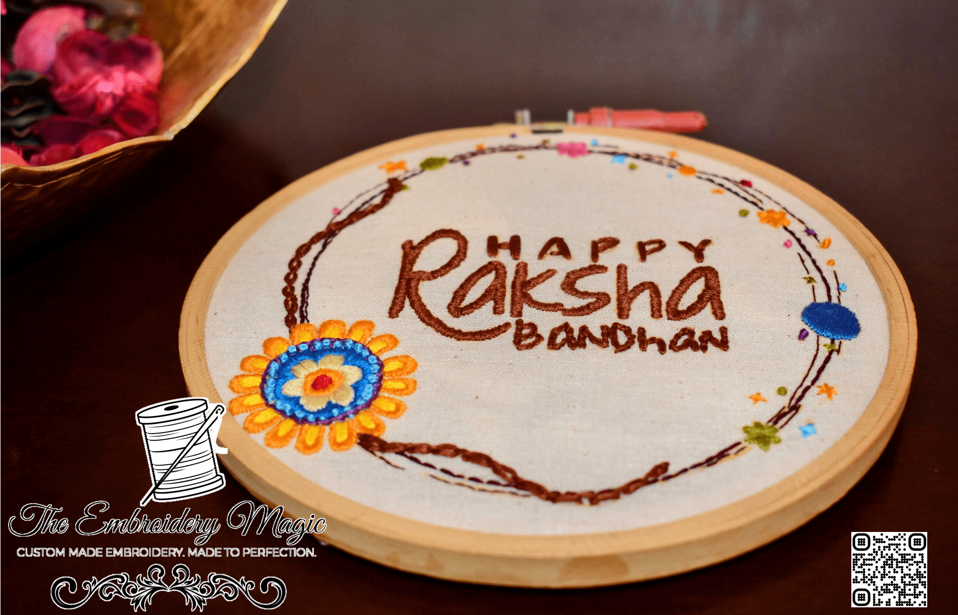 Hand made embroidery from a home-based business. Best suitable for a gift between siblings on the occasion of Raksha Bandhan. The design conveys the wishes for Raksha Bandhan through simple text and intricate and beautifully crafted Rakhi made of multicolor threads of different thickness. The Embroidery is available in a Regular Wooden Embroidery Hoop.